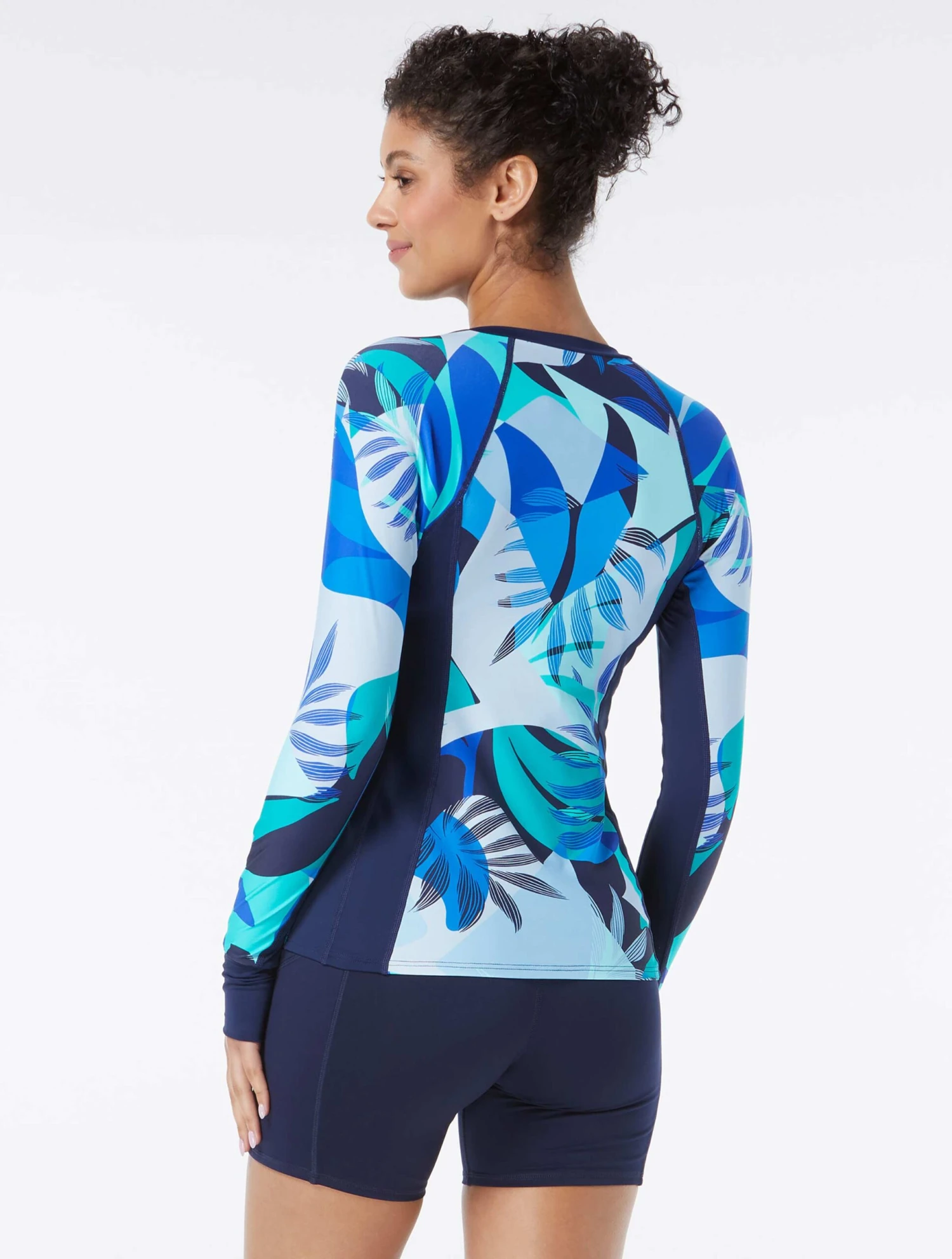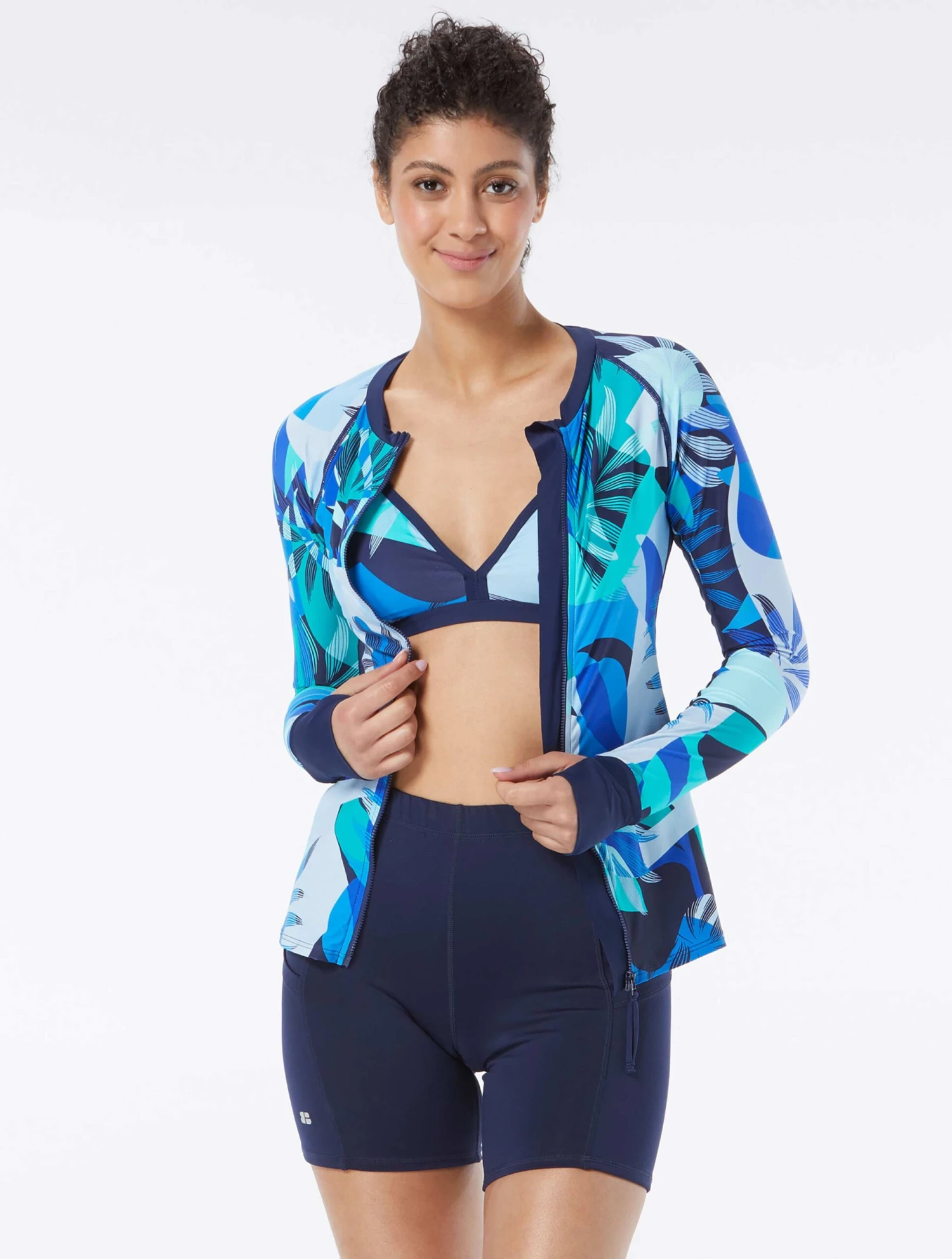 Keep up with your active lifestyle around the water with the Beach House Sport Ava Zip Front Rash Guard in a bold, geo palm print. Designed to be worn over your swim top, this rash guard provides extra coverage from the sun. Beach House is designed with high-end fabrics that bend with you for extra comfort, easy fit and shape retention.