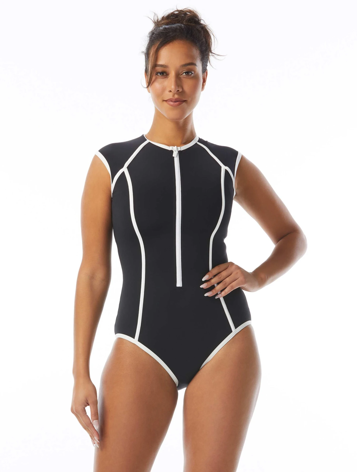 Supportive and sleek, with two in one styling options, the Beach House Sport Endurance Zip Front One Piece Swimsuit has you covered for all your water workouts. In solid colors with white piping paired with a zip front, separate sport bikini top, stay put cups and adjustable straps, this classic one piece is anything but boring.