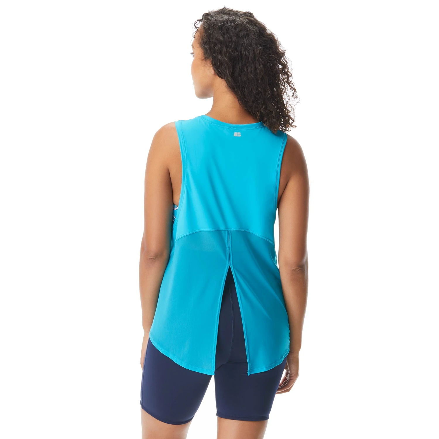Show the back is where it’s at in the Beach House Sport Split Back Tankini. This versatile top offers two looks in one – with a separate, supportive bikini top underneath the lightweight figure-flattering loose fit tankini. Tie the split back hem for a tougher workout or wear it loose for a relaxed fit.