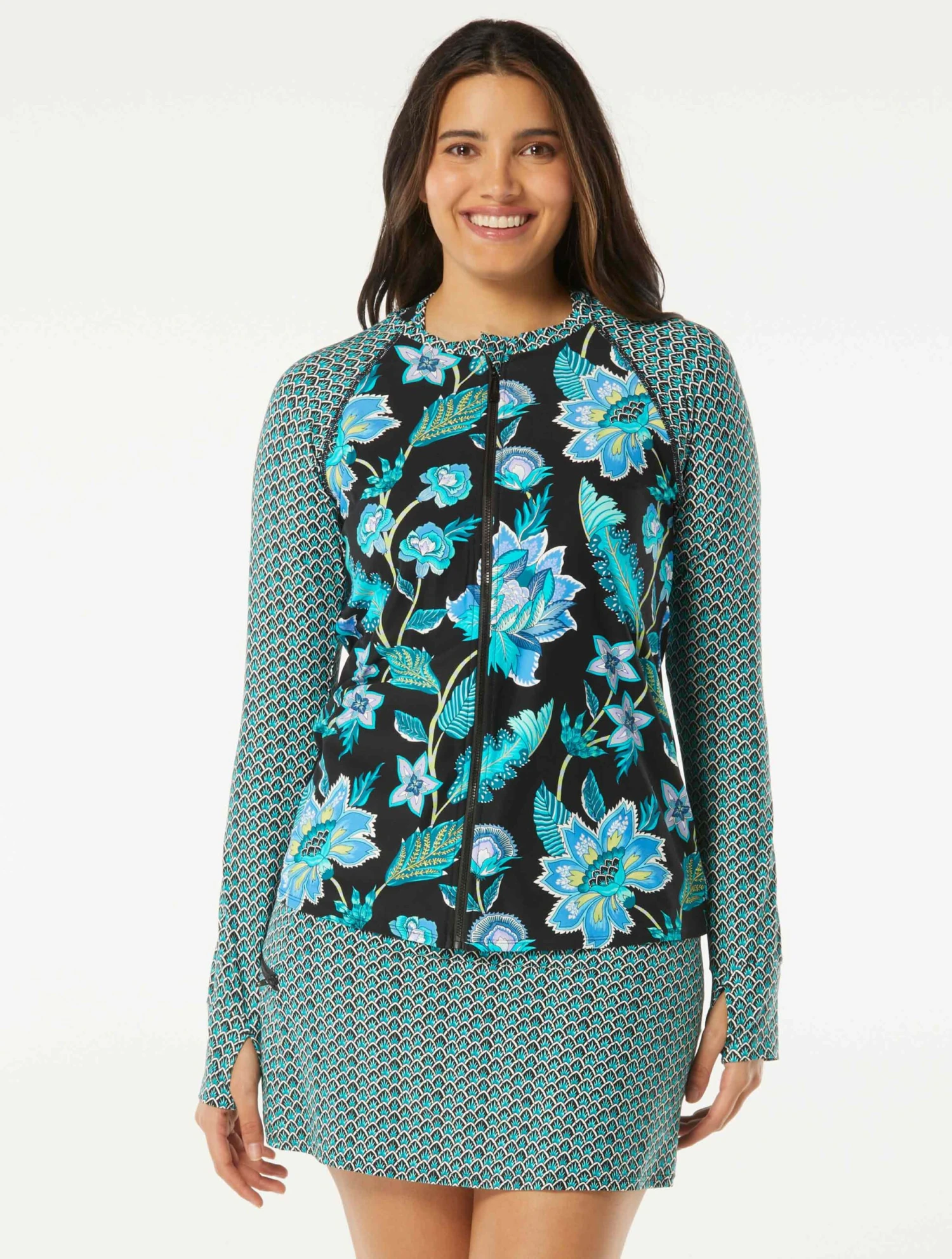 Keep up with your active lifestyle around the water with the Beach House Swim Mary Relaxed Fit Zip Front Rash Guard. This stylish design features a vineyard inspired floral print for a flattering swimwear piece. Designed to be worn over your swim top, this sun guard provides extra coverage from the sun. Beach House is designed with high-end fabrics that bend with you for extra comfort, easy fit and shape retention.