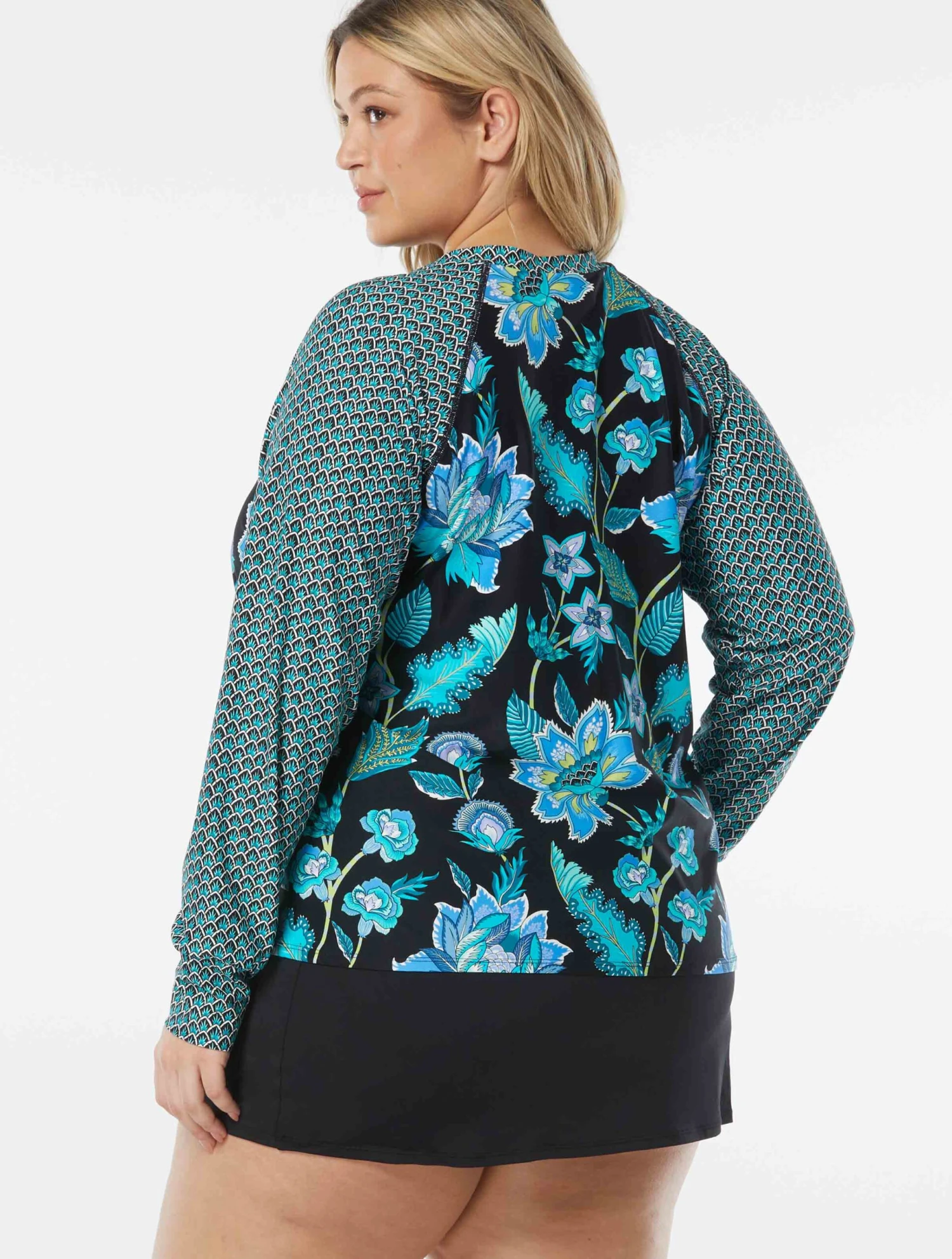 Stay protected from the sun while being fashionable and fun! The Beach House Swim Plus Size Mary Relaxed Fit Ruffled Sun Guard in a vineyard inspired floral print features long sleeves, zip front, 50+ UPF. Beach House swimwear is designed with high-end fabrics that bend with you for extra comfort, easy fit and shape retention.