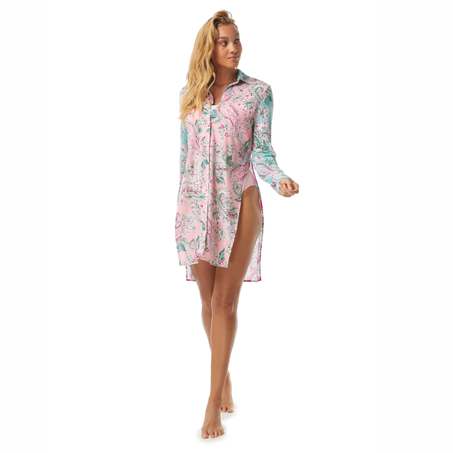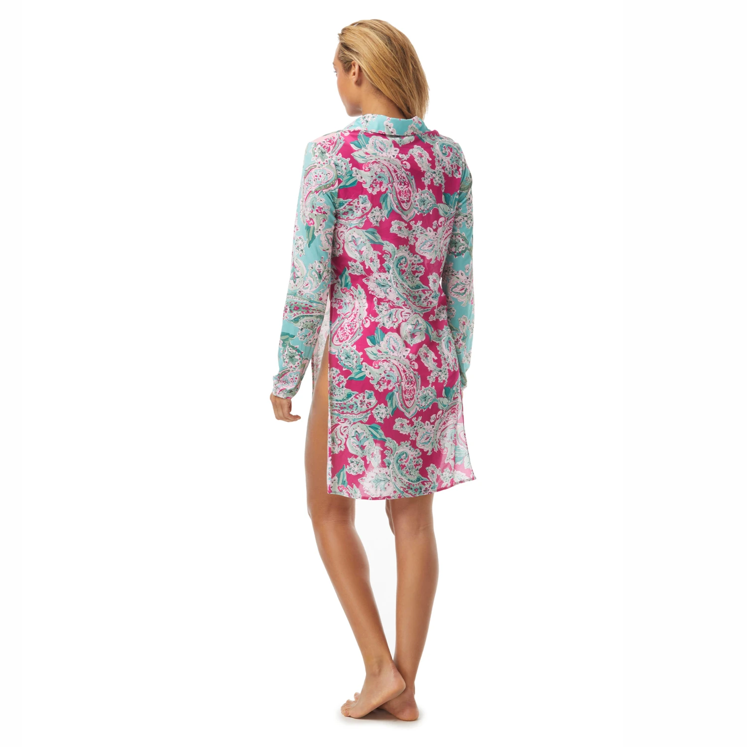 The Carmen Marc Valvo Convertible Front Tie Shirt Cover Up can be worn cinched at the waist or loose fitting to spice up your style several ways. Both ways will have you feeling flirty and fabulous in this whimsical paisley printed cover up!