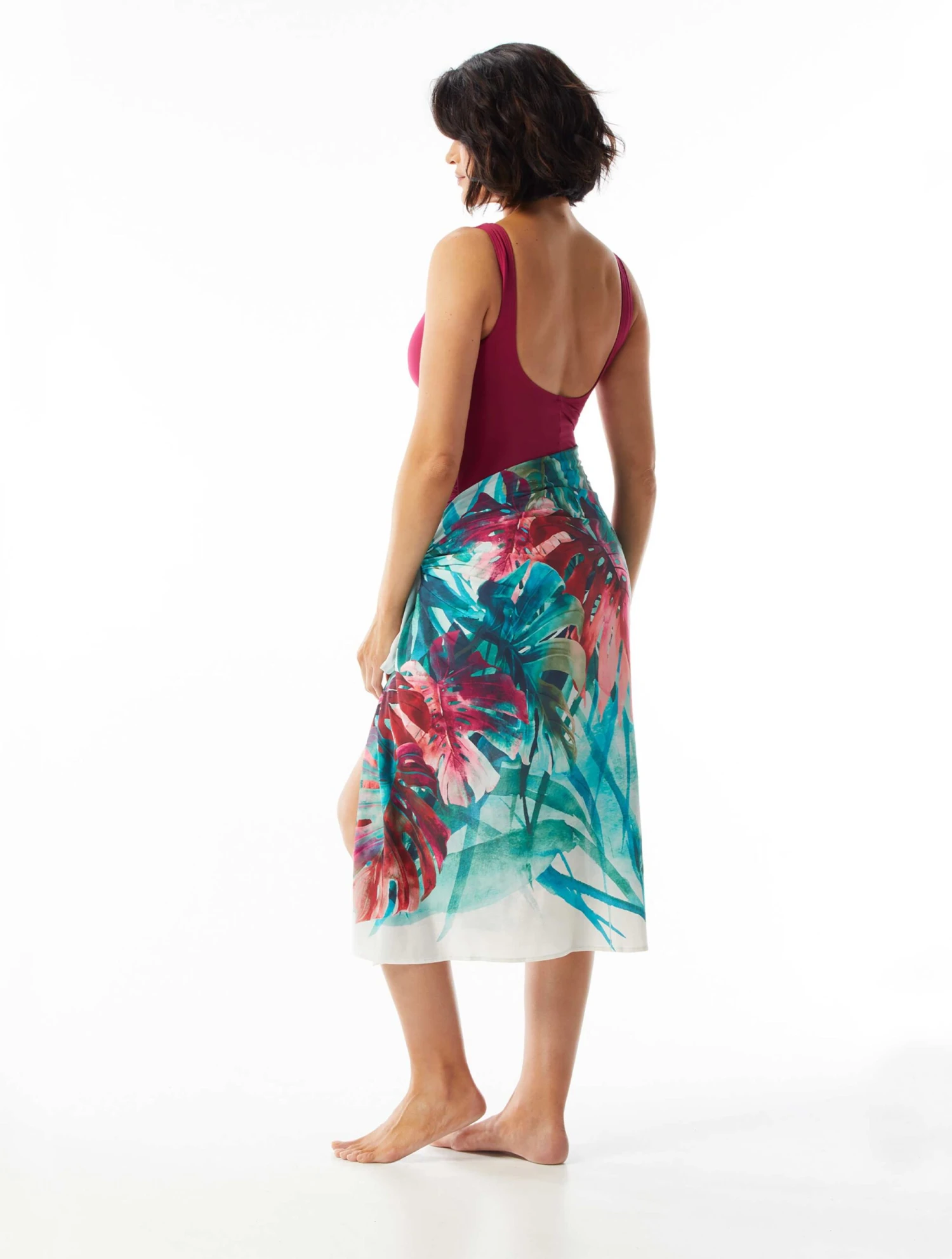 The Coco Contours Topaz Sarong Cover Up in a fun watercolor leaf print, is the perfect cover up to any swimsuit. Wear it as a skirt or switch it’s style to a more moderately covered dress. No matter how you style it, you’ll feel chic and covered for all your sunny days!