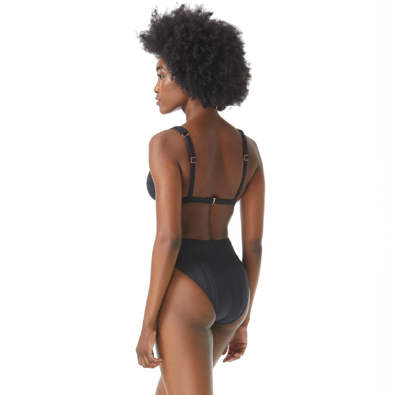 The Vince Camuto Ribbed Triangle Bikini Top features a ribbed fabric, adjustable straps and removable soft cups.